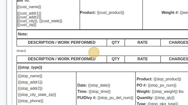 26. In order for a row to loop / repeat, it must be between the [[{{begin}}]] and [[{{end}}]] tags, as shown below. This is very useful for multiple line items, or multiple stops, etc.