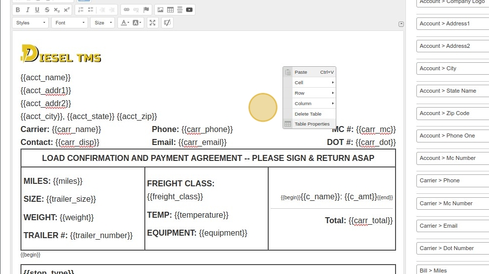 1. Navigate to https://dieseltms.com/pdf_templates and open the PDF Template you'd like to work with. (Or copy an existing one that most closely matches the desired layout)