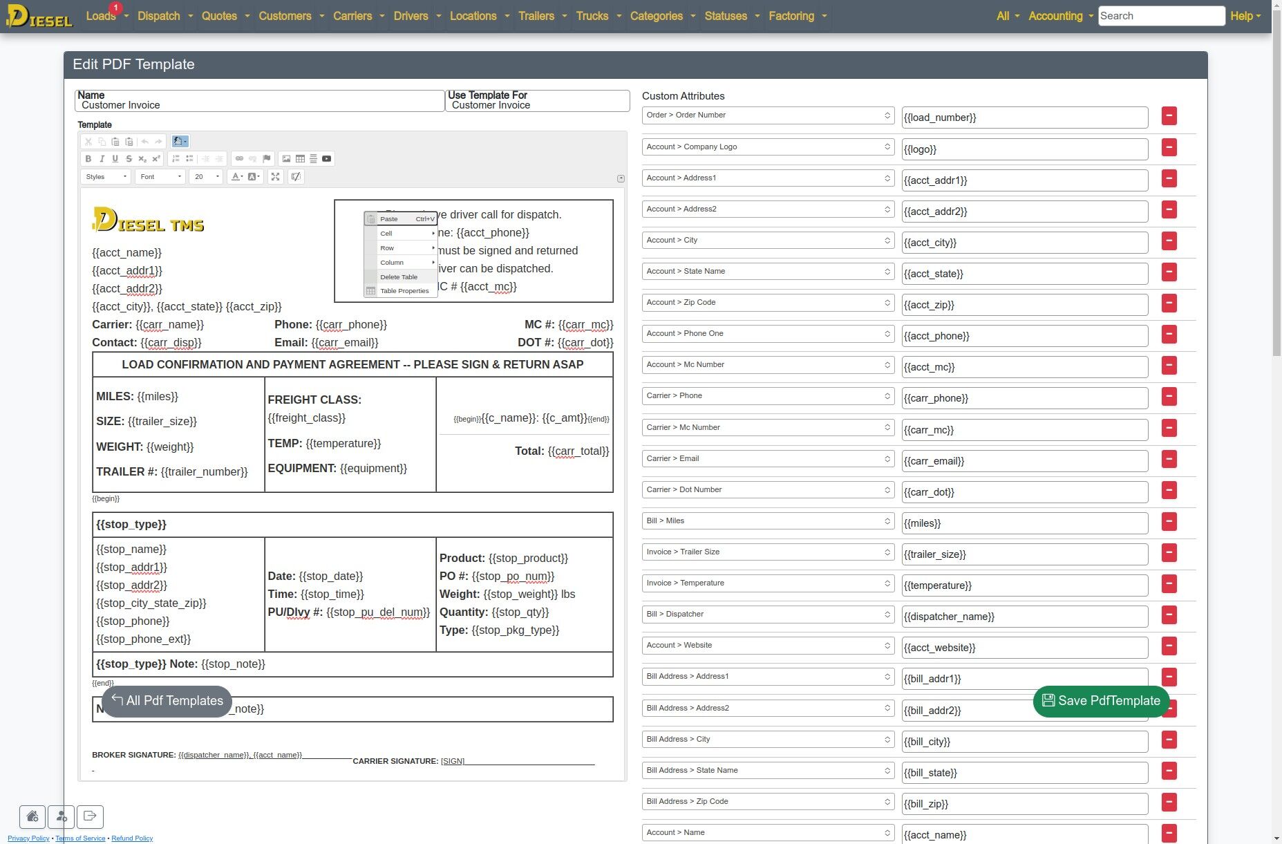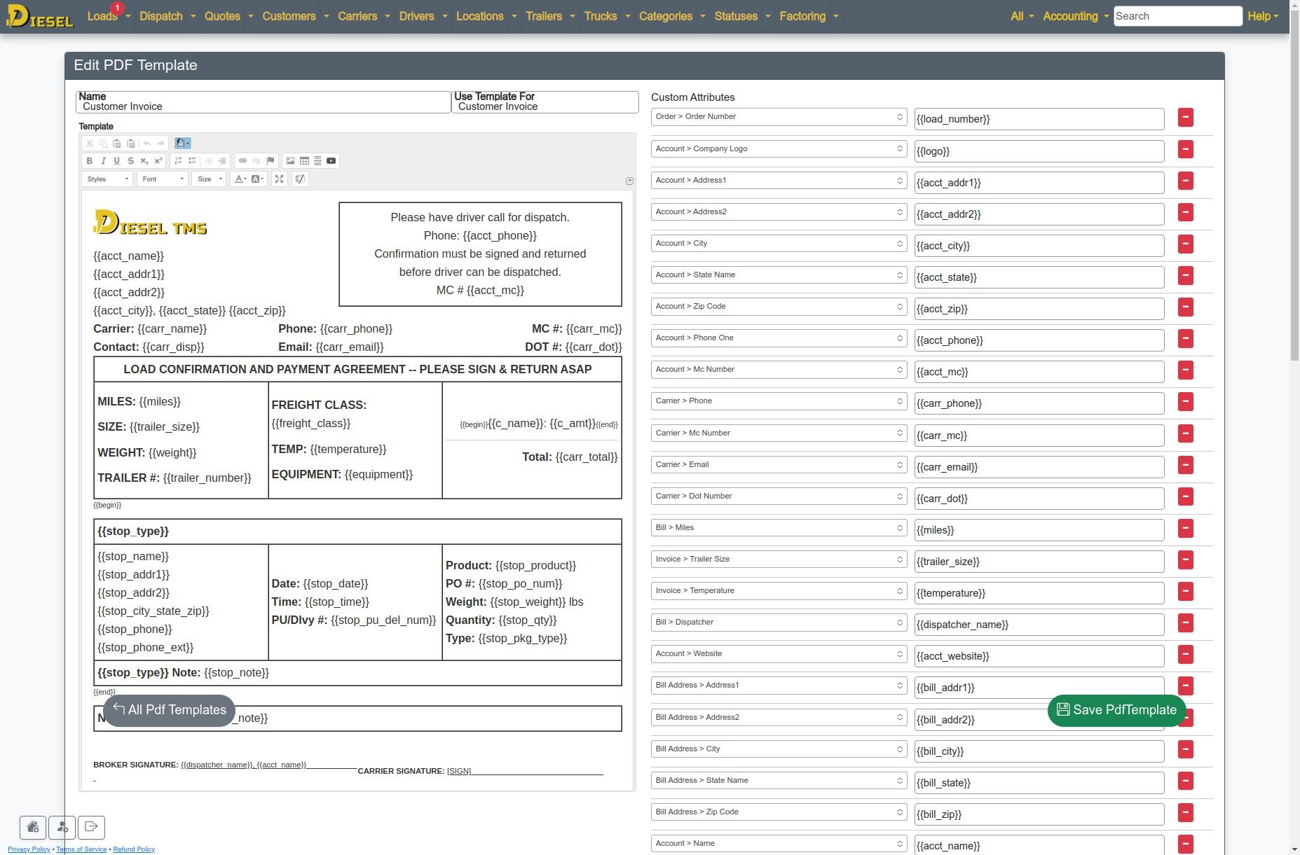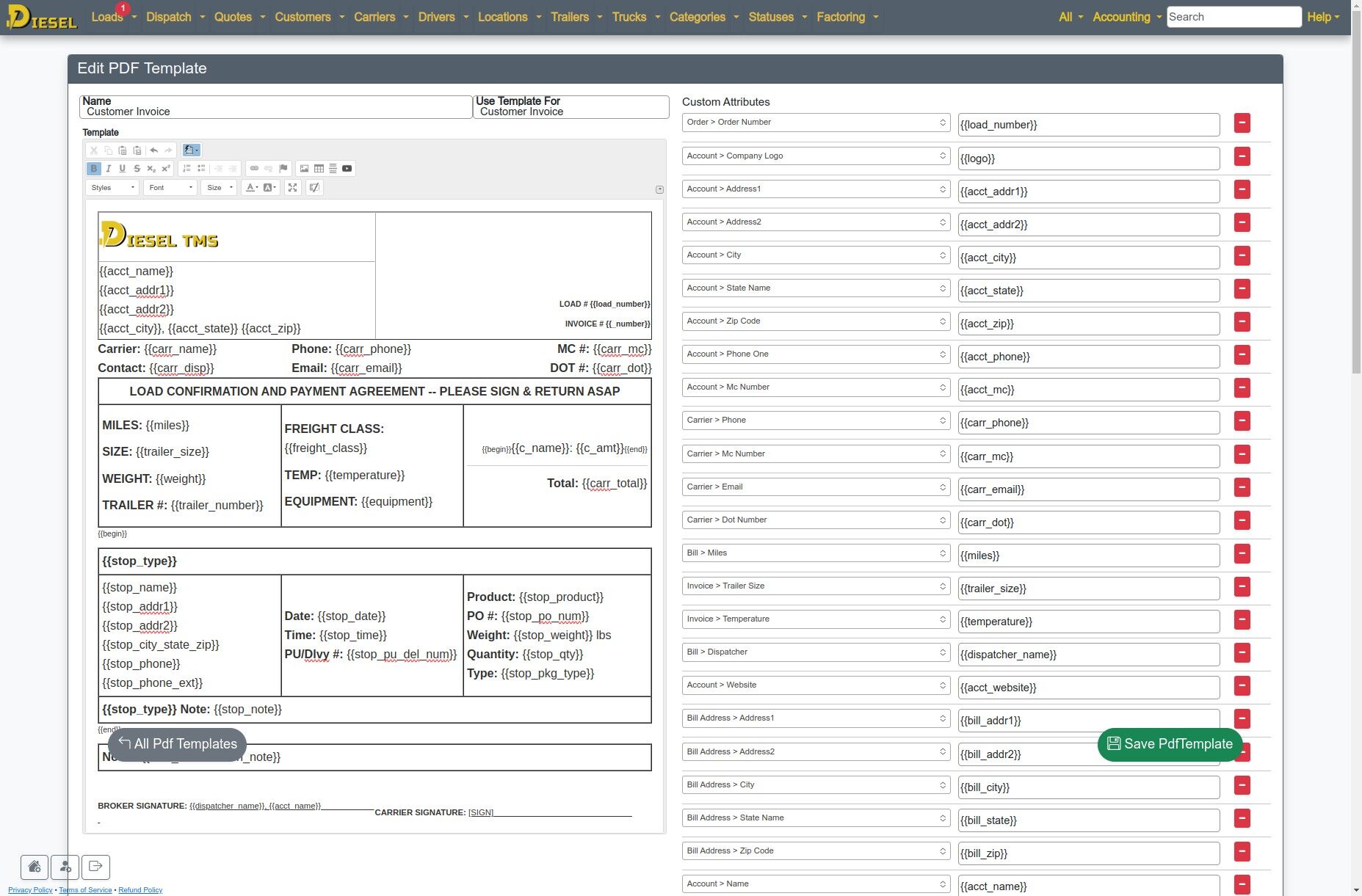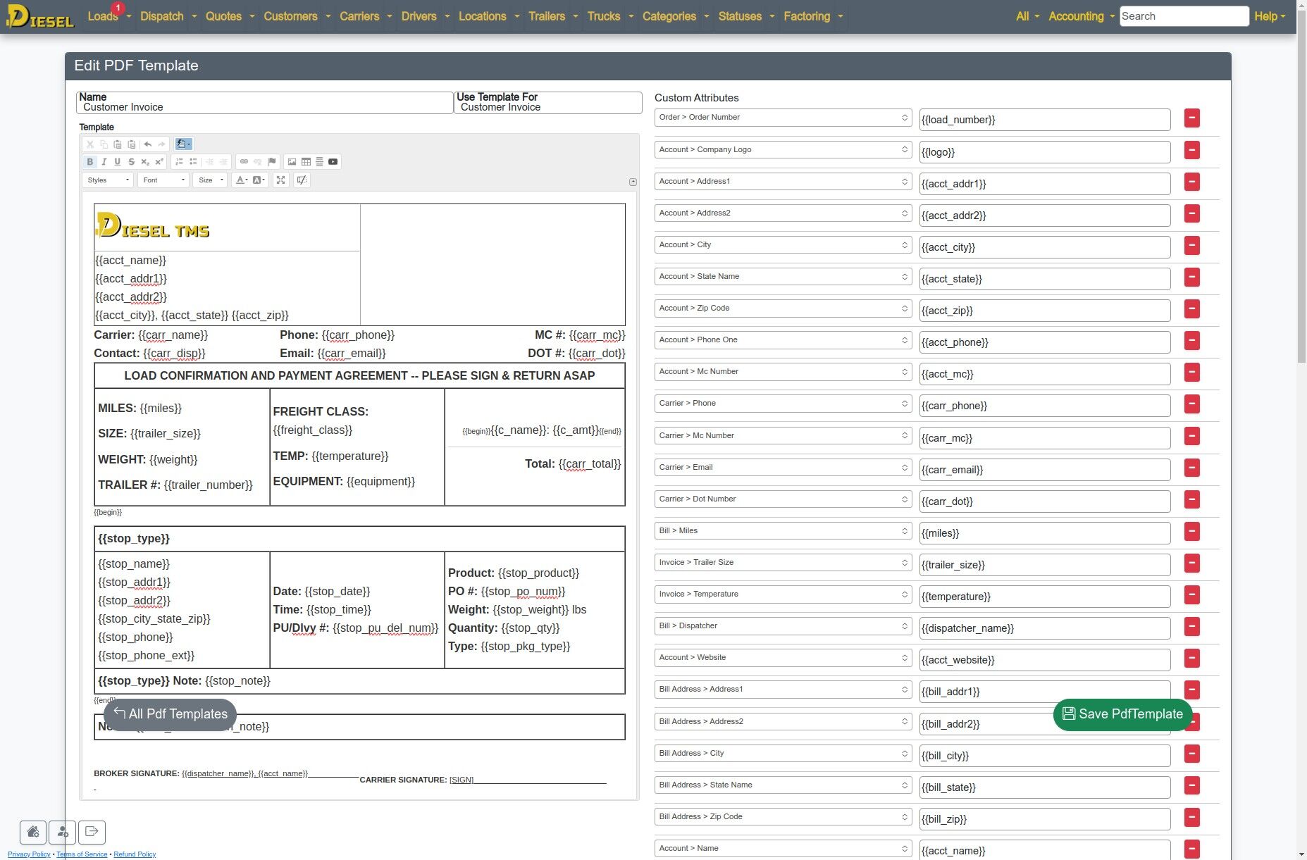 1. Navigate to https://dieseltms.com/pdf_templates and open the PDF Template you'd like to work with. (Or copy an existing one that most closely matches the desired layout)
