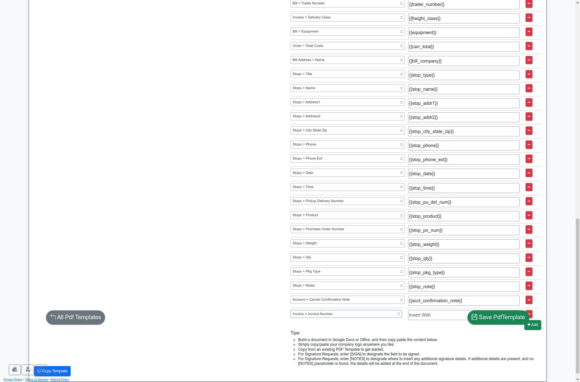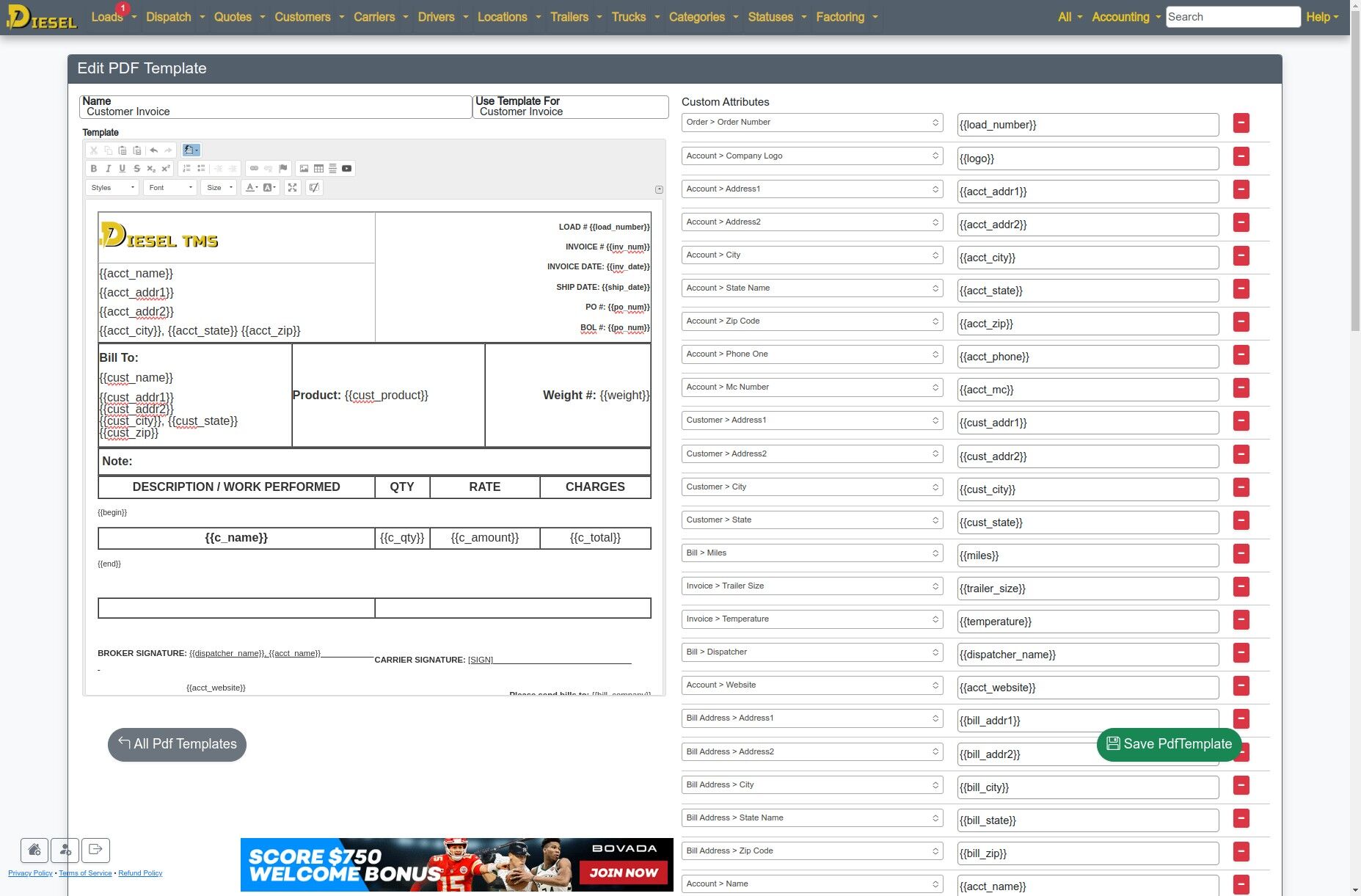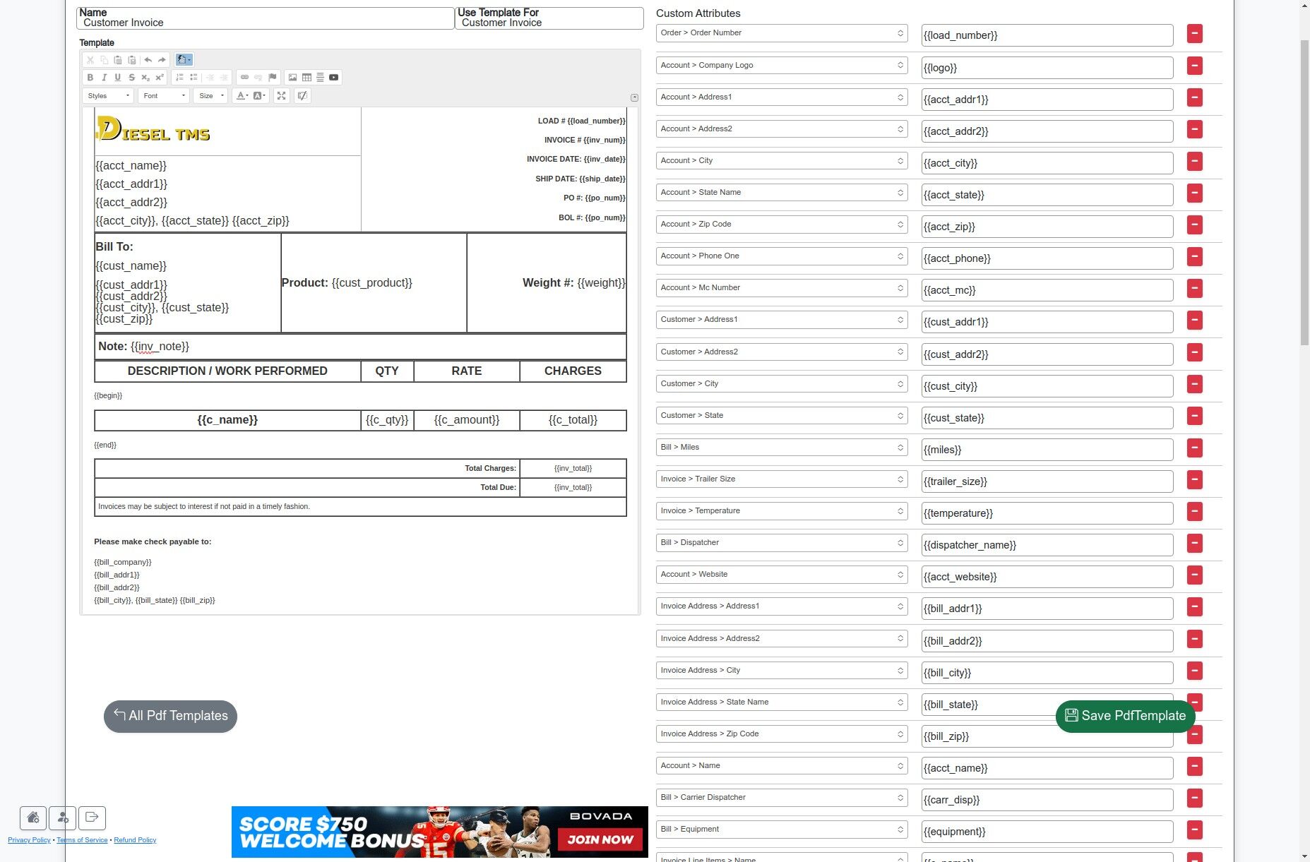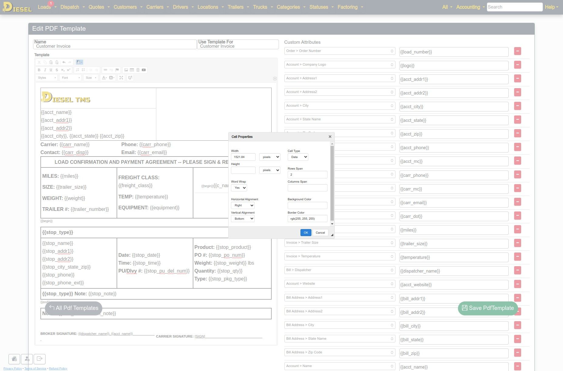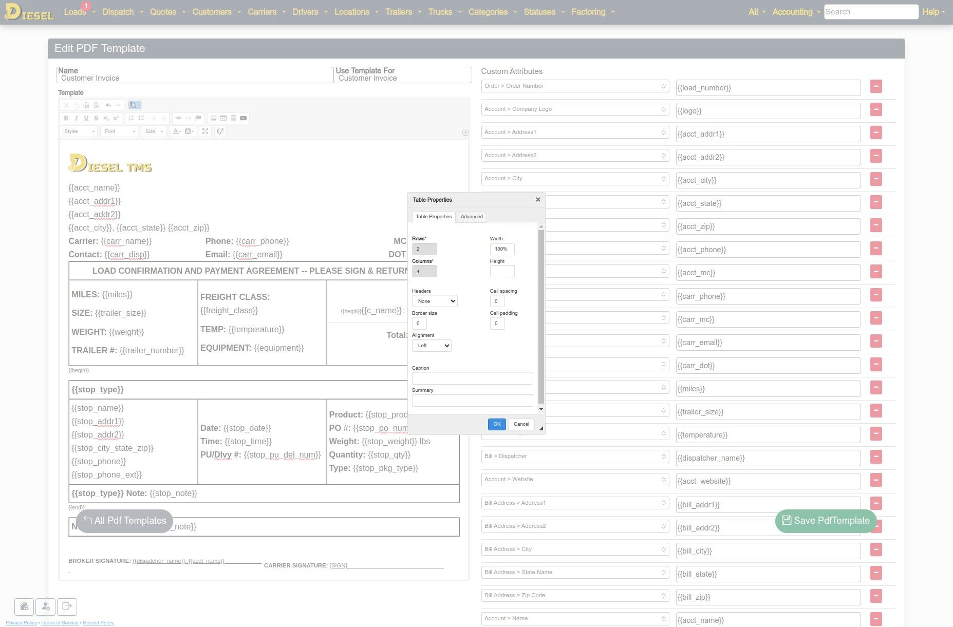 1. Navigate to https://dieseltms.com/pdf_templates and open the PDF Template you'd like to work with. (Or copy an existing one that most closely matches the desired layout)